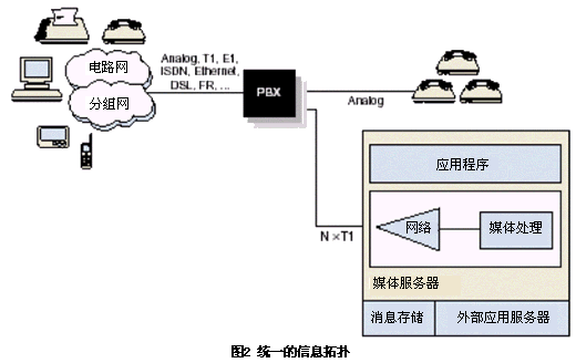 圖2是有前提的典型統(tǒng)一消息拓?fù)鋱D。這個(gè)例子中媒體服務(wù)器管理消息的存儲和提取,這些消息包括語音、傳真、數(shù)據(jù)或視頻。它可以訪問不同媒體文件以及必要的控制規(guī)則以實(shí)現(xiàn)各類媒體業(yè)務(wù)?梢栽诒镜氐拿襟w服務(wù)器上也可以在遠(yuǎn)程的集中存儲系統(tǒng)上進(jìn)行存儲。在這種情況下,能提供語音和傳真資源的統(tǒng)一的消息系統(tǒng)通常和email系統(tǒng)比如微軟的Microsoft