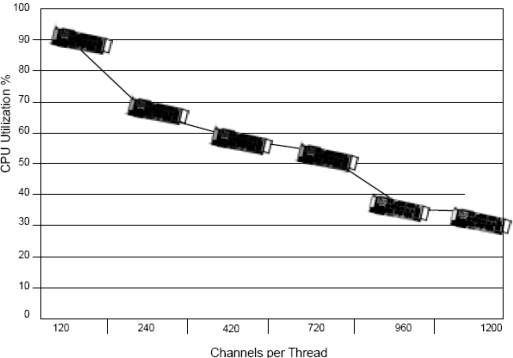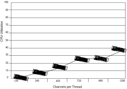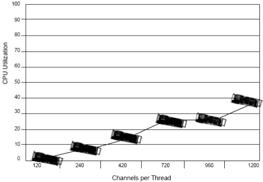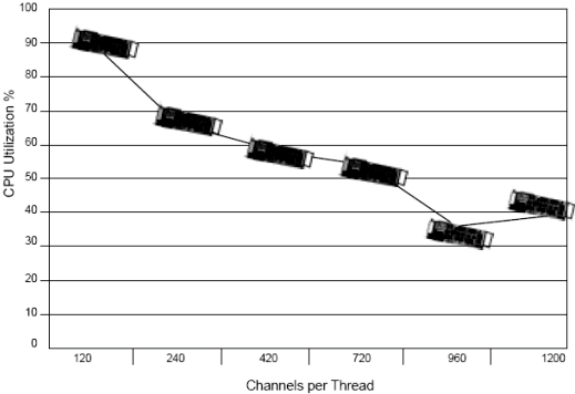 基于1200通道, Dialogic工程師測試了每個線程不同的通道數(shù)(例如每個線程120端口和240端口). 測試結果表明,