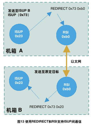例如,一個雙ISUP系統(tǒng)應該由兩個ISUP部分組成,每部分缺省module_id都為0x23。A方ISUP的配置數(shù)據(jù)表示另一個ISUP部分的module_id為0x73;因此,在A方將會有一個重定向的動作來對經過RSI發(fā)送往0x73的任何訊息重新定向。在B方,應該有一個REDIRECT語句將B方RSI所接收的所有目標為0x73的訊息路由到本地ISUP,標識為0x23。具體情況如圖13所示。