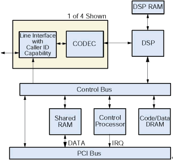 一個板卡上的微處理器控制D/4PCIU和D/4PCIUF通過一個本地總線控制板卡所有操作,它從主機(jī)截獲和執(zhí)行命令。這個微處理器處理實時的事件,管理和主機(jī)交互的數(shù)據(jù)流,提高系統(tǒng)的反應(yīng)時間,減少主機(jī)處理的需求,傳遞給應(yīng)用程序之前處理DTMF和電話信令,把DSP解脫出來專門做信令處理。這個微處理器和主機(jī)的通信是通過一個共享RAM,它作為一個輸入/輸出緩沖區(qū)增加的磁盤文件傳輸?shù)男。這個RAM和主機(jī)的接口是PCI總線。為了滿足實時系統(tǒng)的要求,所有操作的是中斷驅(qū)動的。所有安裝在PC里面的D/4PCIUF板卡共享同一個中斷。在系統(tǒng)初始化的時候,固件從主機(jī)下載到板卡上的代碼/數(shù)據(jù)