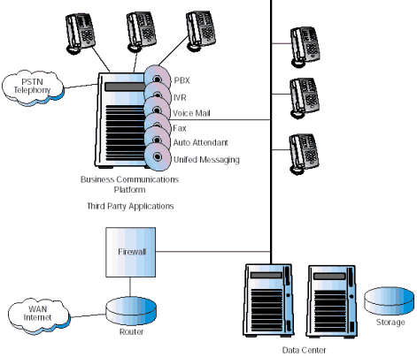 圖1描述了當(dāng)前一個(gè)典型的復(fù)雜的企業(yè)通信系統(tǒng)配置。連接到PSTN的主要部分PBX/KTS,仍然是系統(tǒng)的核心,提供了交換和自動(dòng)呼叫分配的功能。一系列增加的應(yīng)用通過(guò)附屬服務(wù)器連接到PBX/KTS上。很多附屬服務(wù)器也連到數(shù)據(jù)中心上,因?yàn)樗鼈冃枰L問(wèn)企業(yè)的數(shù)據(jù)。 使現(xiàn)有情況變得更為復(fù)雜的是,Internet正在變?yōu)椴豢扇鄙俚纳虅?wù)工具,各公司紛紛安裝VoIP以降低網(wǎng)絡(luò)成本,滿(mǎn)足多媒體通信的需要。這些服務(wù)由企業(yè)防火墻后的網(wǎng)關(guān)提供,這個(gè)網(wǎng)關(guān)也是連接到PBX/KTS上的。