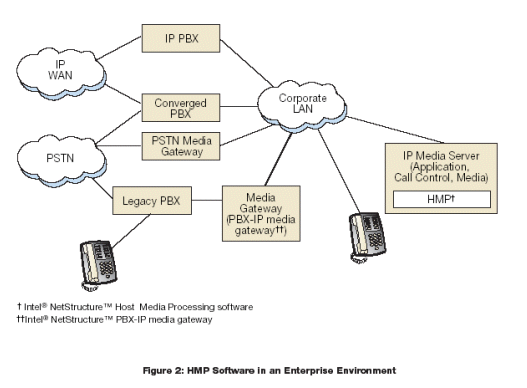 圖2表示使用HMP軟件的IP媒體服務(wù)器,部署在企業(yè)環(huán)境的例子,包括IVR,自動(dòng)應(yīng)答,語音郵箱,統(tǒng)一消息,語音識別和會(huì)議服務(wù)。