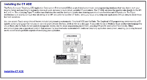 CT ADE - 圖形化的 VOS 8.2 SP1,是Dialogic 最新版本的電話應用開發(fā)工具。這些工具包括信息流圖產生器,VOS源碼編輯器,VOS源碼編譯器,VOS