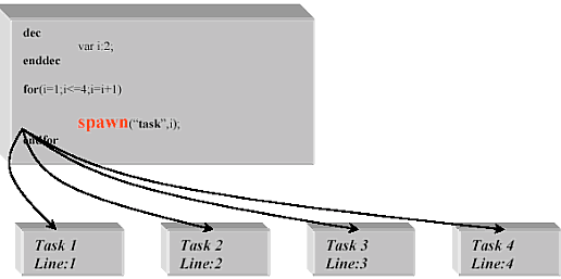 VOS內部同時運行4個任務。開始只有一個任務,此任務產生了4個任務,各任務間互相傳遞參數(shù)(通道號)。函數(shù)arg(1)檢索參數(shù)個數(shù)1,這種情況下,arg()是通道號碼。