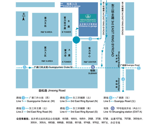 場館交通信息 名 稱:北京富力萬麗酒店 Renaissance Beijing Capital Hotel 公 交:特3路/特8外環(huán)主路/特8快車內環(huán)/特8內環(huán)主路/特8快車外環(huán)/特8外環(huán)/特8內環(huán)/28路/7區(qū)間(高峰車)/37路/57路/運通107線/214夜班/300內環(huán) 300快車內環(huán)/300快車外環(huán)/300外環(huán)/348路/683路/686路/707路/801路/802路/974路/976區(qū)間 雙井橋北站下車 地 鐵:10號線雙井站下